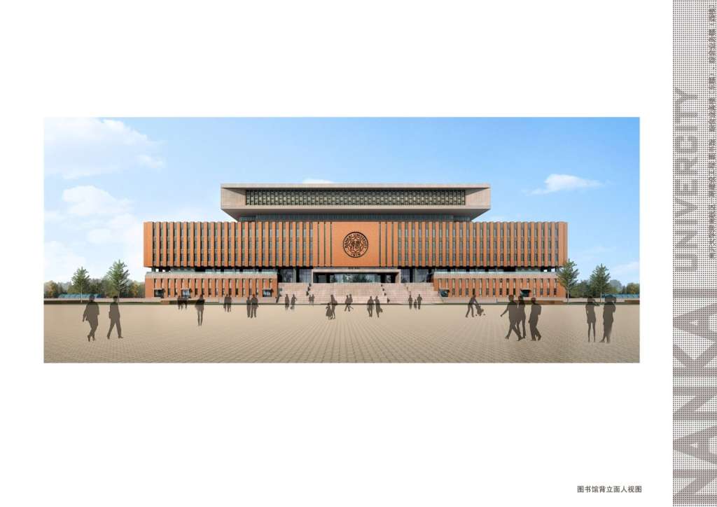 南开大学图书馆、综合业务楼建筑群及其庆典广场位于津南新校区地块南侧中心地带,正对校区南侧主入口,南侧人流通过与地块南侧纬八路、先锋河间200米宽绿化带,进入逐步坡起的庆典广场,广场比周围规划路高出1.5米,建筑群以品字形分布于广场之上,图书馆位居中间,成为视线的焦点。图书馆与两侧的综合业务楼,整体设计,形成一组有一定规模和体量的建筑群,以一个整体作为校区纵向轴线的起点与体育馆首尾呼应。