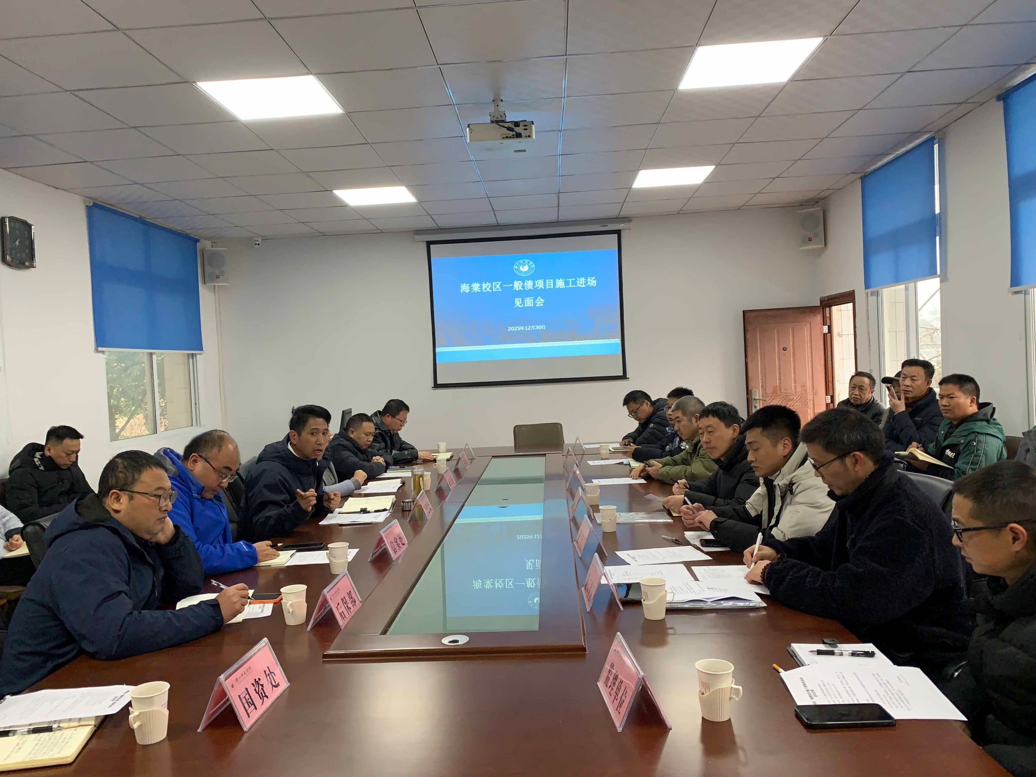 本网讯(文/昝亚楠 图/杨耀)12月30日下午,海棠校区一般债项目施工进场见面会在梅庄四楼会议室召开。基建处处长宋天华主持会议,学工部、保卫处、审计处、信实处、后保部、国资处等校内职能部门,以及项目设计、施工、监理单位相关负责人参加会议。